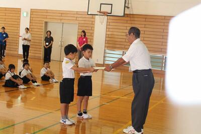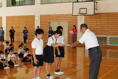 その後、硬筆習字と市水泳記録会の入賞者の表彰を行いました。硬筆習字は、全学年が熱心に取り組んだので、多くの入賞者が出ました。嬉しい限りです。代表して6年生の小河さんに賞状を授与しました。