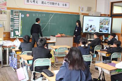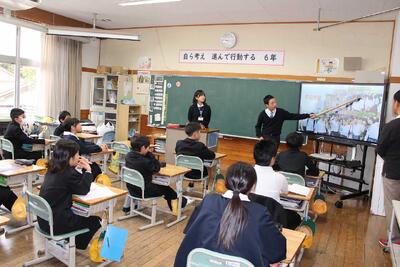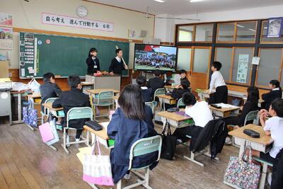 11月7日(金) 5日(水)から3日間、哲多中学校から本校に職場体験に来ていた山室先輩と吉尾先輩に、4月から哲多中学校に進学する6年生が、中学校生活について教えてもらいました。作成してきたスライドを使って、授業、部活、学校行事などについて説明してくれました。一緒に小学校生活を送った本校の先輩たちなので、6年生も気軽に質問できたようでした。それらの質問に、堂々とていねいに答えていく中学生に、さすがだなと感心しました。6年生たちも、先輩たちの成長ぶりに感心、あこがれの気持ちを抱き、自分もがんばらねばと思ったことでしょう。