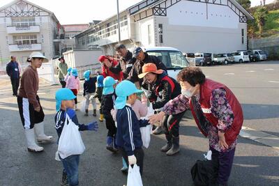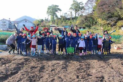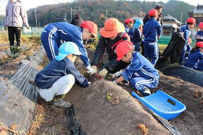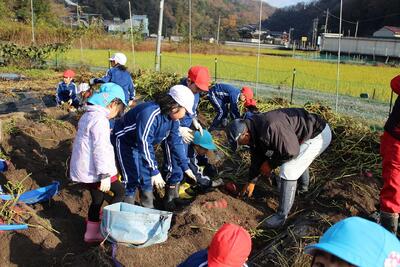 11月26日(水) 6月に苗を植えた「さつまいも」を収穫しようと、1・2年生が、ボランティアの皆さんにお手伝いいただいきながら、こども園のぞう組さんと一緒に「いもほり」をしました。ワクワクドキドキしながら土をほり、たくさんのさつまいもが収穫できた喜びをみんなで分かち合いました。